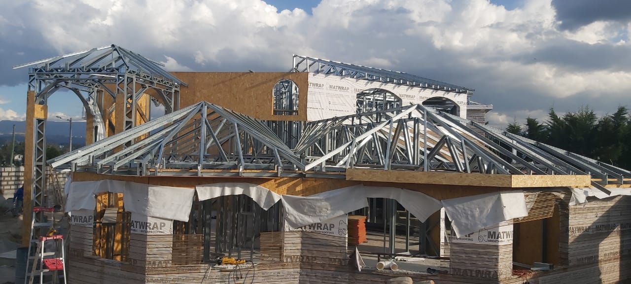 Revestimiento Estructural: El revestimiento estructural debe aplicarse en todas las superficies exteriores, el espesor varía entre 9 y 12mm en el caso de Tableros de Partículas Orientadas (OSB). El revestimiento estructural debe cubrir toda la altura del panel desde el canal base hasta el canal superior. Todos los extremos y áreas interiores de los tableros de revestimiento estructural deben atornillarse a los perfiles y canales.