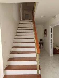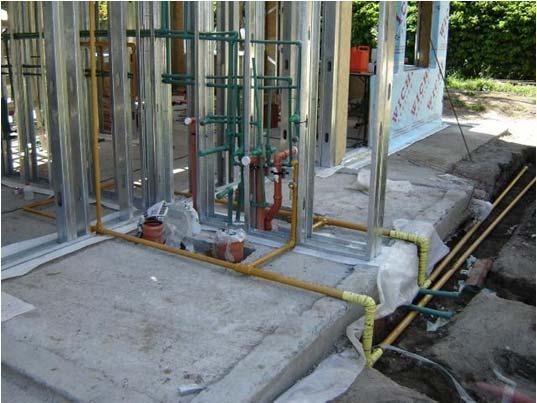 En el caso de las plantas superiores, las tuberías de polipropileno, tanto para agua fría como caliente, ascienden desde la placa del suelo hasta los puntos donde se instalarán los terminales, en cocina y baños. Los conductos de salida de agua también se colocan en el interior de la placa, aprovechando los casi treinta centímetros de espacio disponible entre plantas, lo que permite desniveles de drenaje satisfactorios, descendiendo por el interior de los muros en la planta inferior, conectándose posteriormente a la red pública. o una fosa séptica. En el caso de la instalación de fontanería en plantas bajas, se utilizará la pared y el suelo como se hace normalmente en las obras convencionales. Naturalmente, existe la gran ventaja de no tener que perforar el ladrillo, ya que se aprovechan los orificios de los perfiles metálicos y las paredes aún no están revestidas.