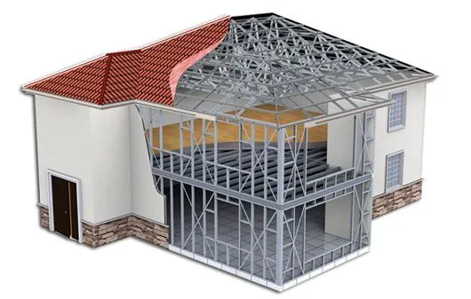 La resistencia de la estructura está asegurada por el acero. En este sentido, una casa en el sistema Termo-Steel no se diferencia de cualquier otra casa de mampostería. Obviamente, la solidez estructural de cualquier casa corriente está asegurada por el uso de varillas de hierro incrustadas en columnas de cemento. Sin embargo, en el primer caso, se utilizan perfiles y vigas de acero galvanizado en espaciamientos de 60 cm o menos. Suponiendo una casa de tamaño normal, con planta baja y planta alta, en total 200 m2, por ejemplo, alrededor de 1.300 m de perfiles verticales, 500 m de vigas de piso, 500 m de vigas de techo y 800 m de canales más cientos de otros elementos esenciales.